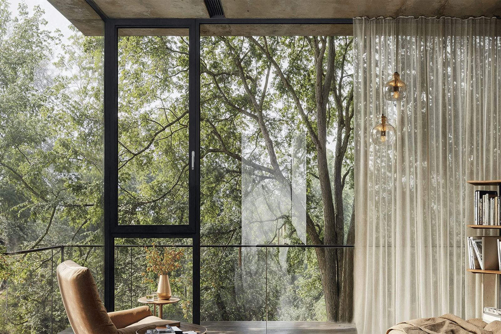 框扇室內(nèi)外平齊設(shè)計(jì),線條簡(jiǎn)約利落,立面效果簡(jiǎn)潔平整。窗扇開(kāi)啟狀態(tài),開(kāi)啟扇與建筑外立面平行。